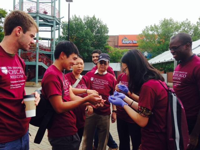 芝加哥大学医学生在免费检测开始前最后用自己的手指练习釆血
